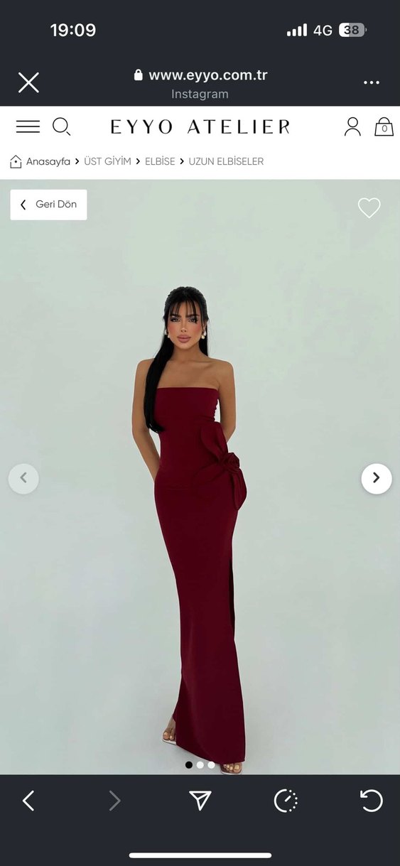 Bordo renkli, straplez ve drapeli uzun elbise, ince kesimi ve ipeksi dokusuyla romantik akşamlar için ideal.