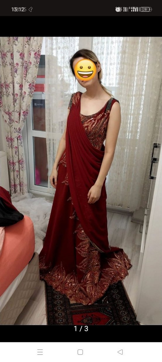 Bordo renkte, straplez yaka ve drapeli tasarıma sahip uzun kına elbisesi. Desenli ve salaş kesimiyle düğünlerde şık bir görünüm sunar. Kolsuz ve klasik zarif stilde.