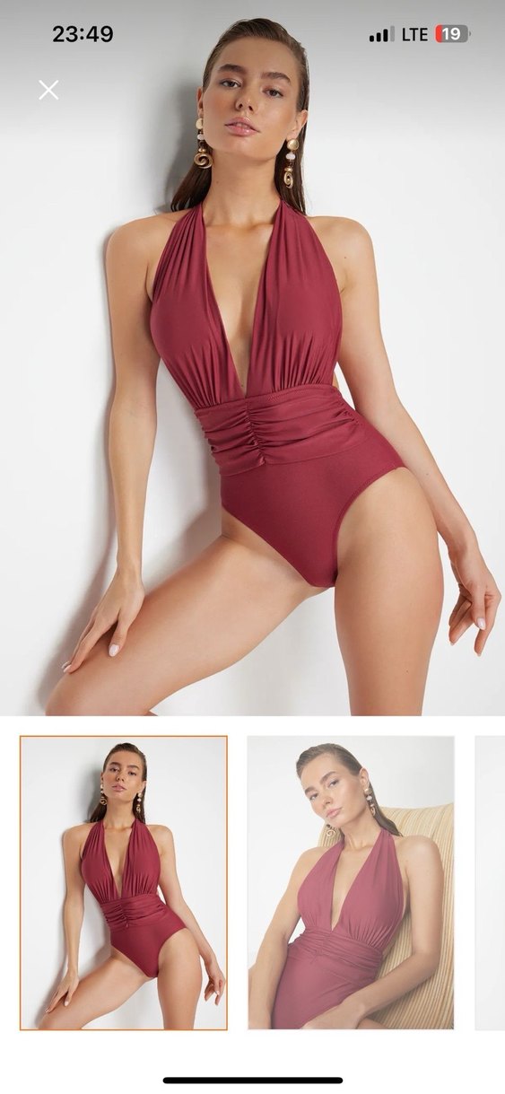 Bu bordo renkli kadın mayo, derin V yakası ve drapeli detaylarıyla dikkat çeker. Strappy askılı, midi boy ve modern tasarıma sahiptir.