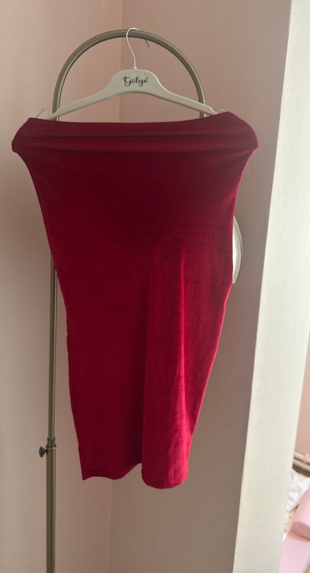 Bu bordo drapeli süet hamile eteği, parlak yüzeyi ve dar kesimiyle romantik akşamlar için uygundur. Minimalist ve çağdaş stilde, midi boydadır. ✨