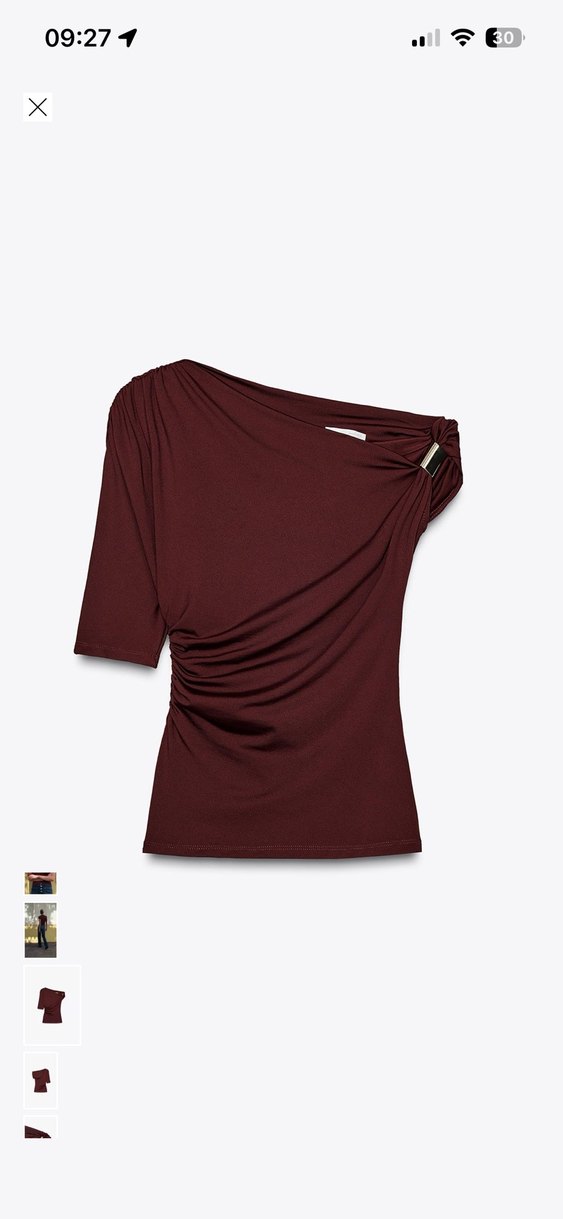 Bordo renkli, drapeli ve tek omuz detaylı, kısa kollu, satenimsi kumaştan yapılmış, modern tarzda dar kesim bluz. Günlük kullanıma uygun.