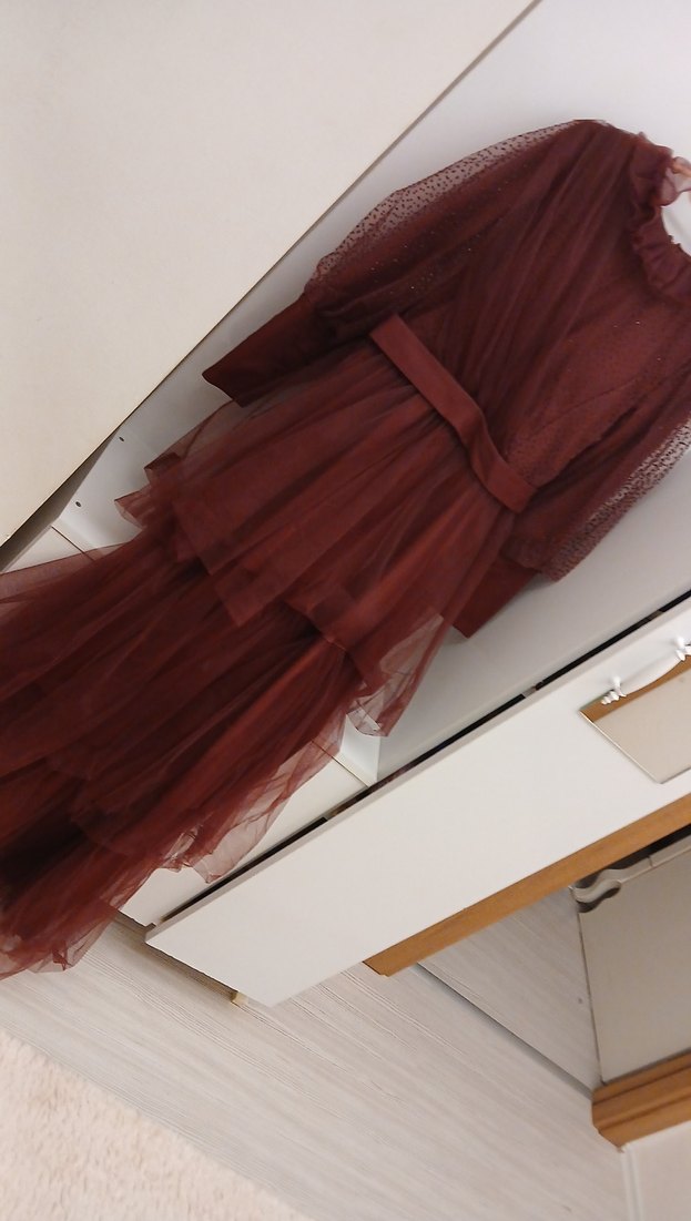 Bordo renkli, drapeli ve ince askılı, tek renk uzun abiye elbise. Tekne yaka ve katmanlı tül detaylarıyla şık ve zarif bir görünüm sunar.