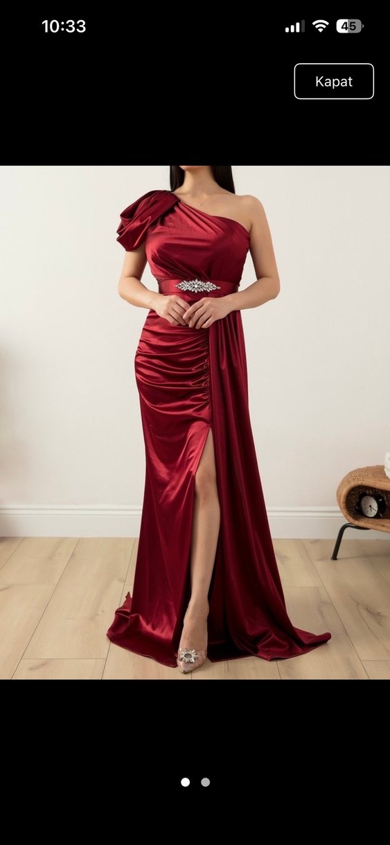 Bordo renk, drapeli uzun abiye elbise. Straplez yaka, tek askılı ve parlak dokusuyla düğünler için uygun klasik şıklık sunar.