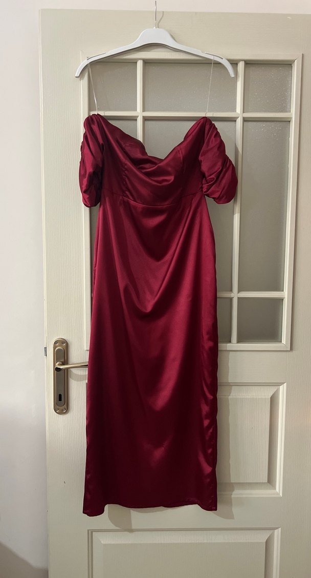Bordo parlak kumaştan, drapeli ve straplez uzun abiye elbise. Modern klasik tarzda, ince kesim ve askılı kollara sahiptir. Hiç giyilmemiştir.
