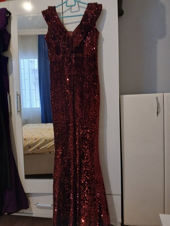 Bordo renk, drapeli, V yaka ve kolsuz uzun abiye elbise, şık ve fit kesimiyle partiler için uygundur. ✨