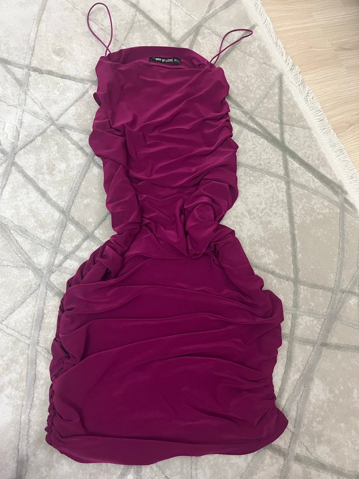 Bordo renkli, drapeli tasarıma sahip, straplez yaka ve ince askılı, vücuda oturan uzun abiye elbise.