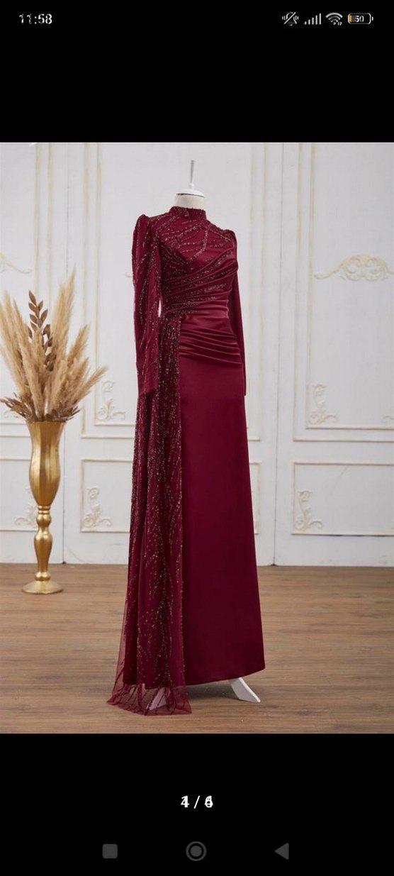 Bordo uzun abiye elbise, yüksek yakalı ve uzun kollu, drapeli ve desenli tasarıma sahiptir. Düzenli kesim ve parlak yüzeylidir, düğünler için uygundur. ✨