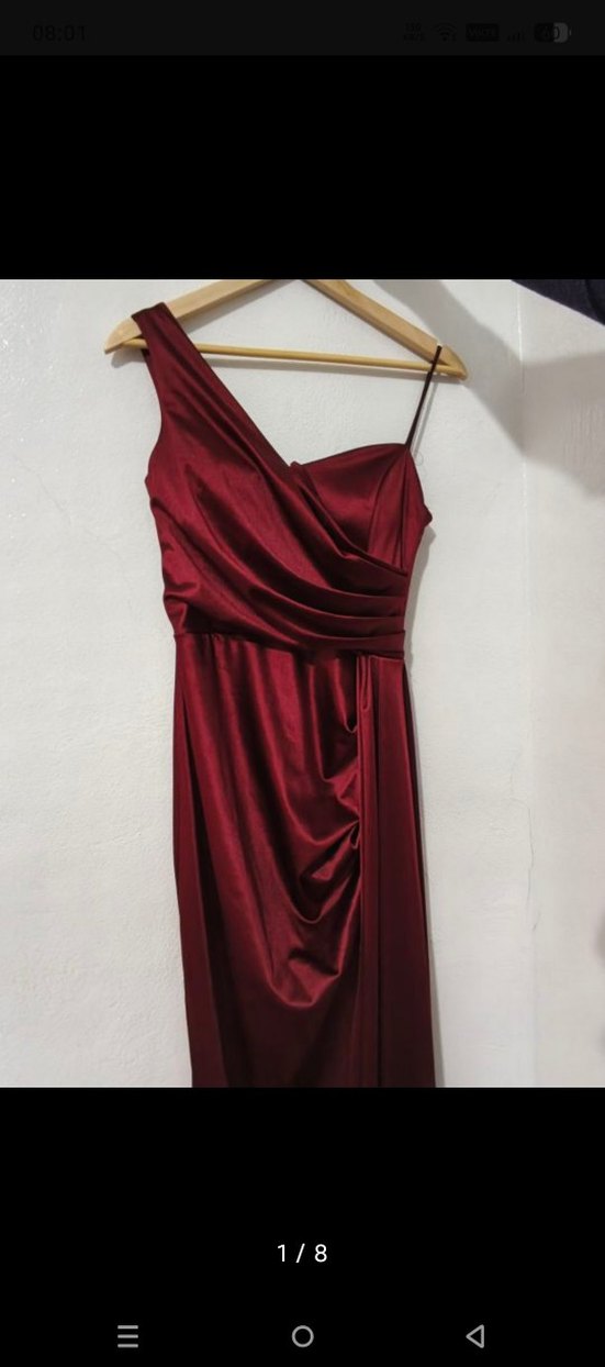 Bordo renkte, drapeli ve askılı uzun abiye elbise. Düğün ve özel davetler için modern klasik tarzda, vücuda oturan kesime sahiptir. sadece bir kere giyilmiştir satılık fiyatıdır.