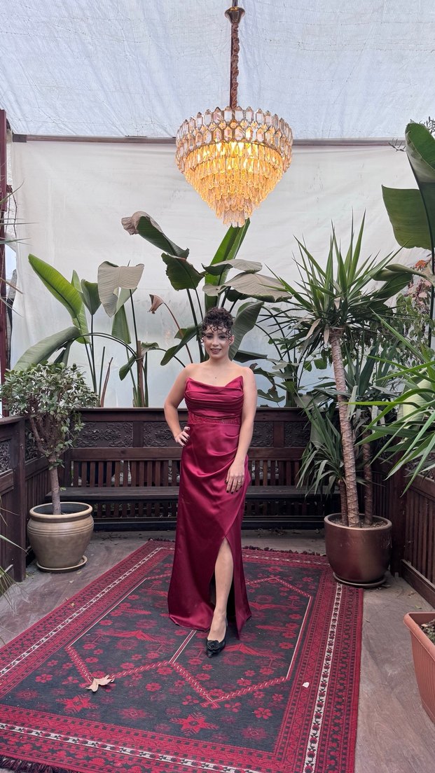 Bordo renkli, straplez yakalı ve drapeli detaylı, parlak görünümlü uzun abiye elbise. İnce kesimli ve askılı kollu, modern ve şık bir tasarım.