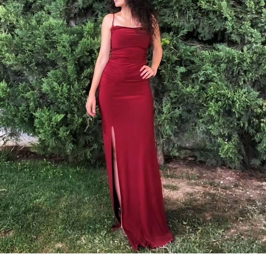 Bordo renkli, drapeli ve straplez yaka detaylı bu uzun yırtmaçlı elbise. 1 kere giyildi