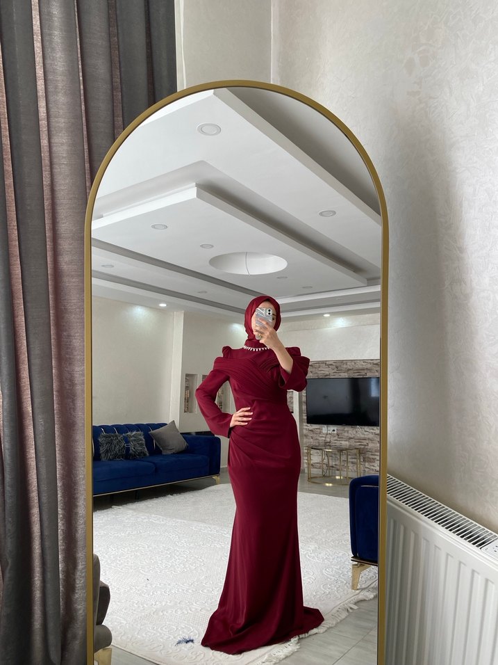 Bordo Drapeli Uzun Abiye Elbise