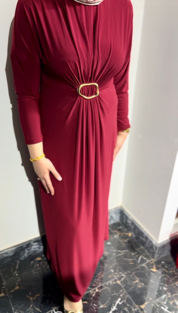 Bordo renk, oturan kesim, drapeli ve belde dekoratif tokalı uzun elbise. Kayık yaka ve askılı kol detaylarıyla, parlak sentetik kumaştan üretilmiştir.