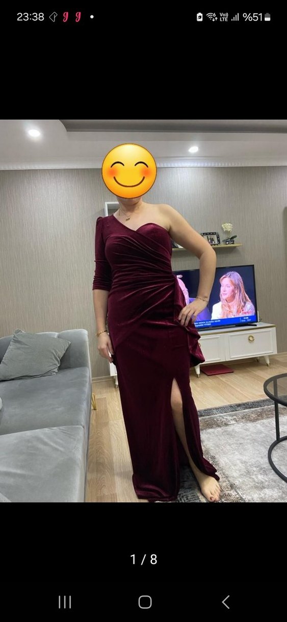 Bordo renkte, drapeli uzun abiye elbise. Straplez yaka, tek askılı kol ve yırtmaç detaylarıyla cesur, şık bir tasarım. Parti için uygun.abiye birkez giyildi hiçbir deformasyon yok giyen kişinin boyu 167 kilosu 73 ölçüleri iki koltuk arası 45 bel 38 boyu 161 cm esneme payı vardır giyen kişinin ölçüleri göğüs 94 bel 82 baseni 108