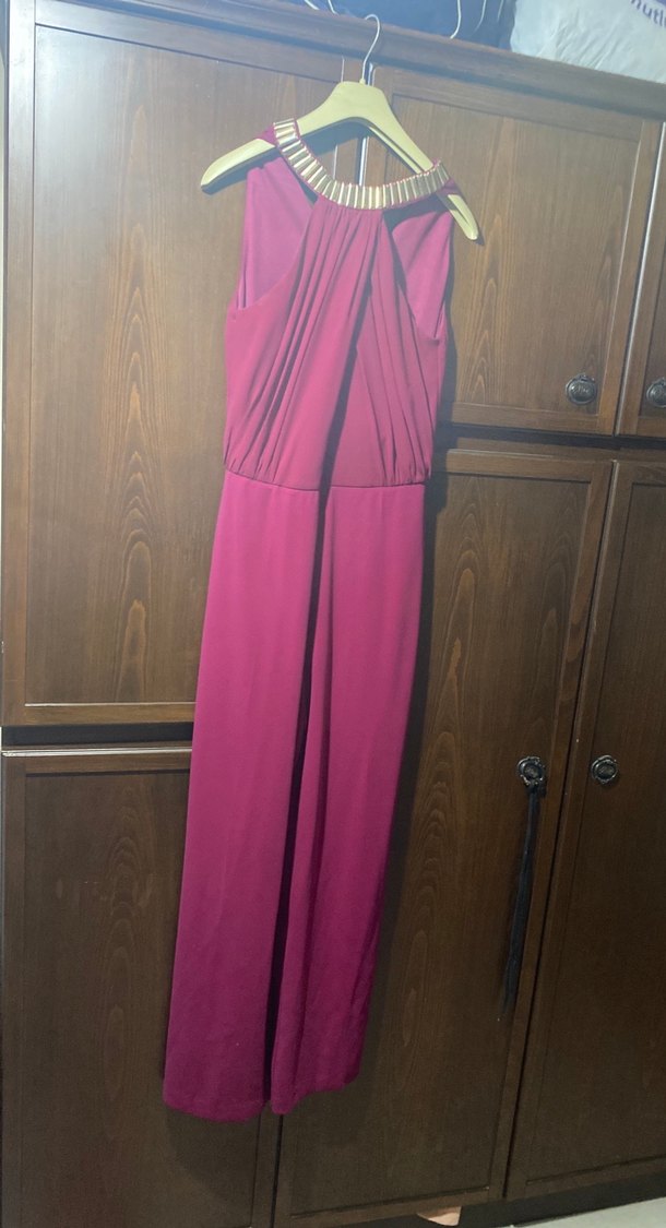 Bordo renkte, drapeli ve yüksek yakalı, kolsuz uzun abiye elbise. İnce oturan kesimi ve minimalist tasarımıyla düğün için uygun klasik şıklık sunar.