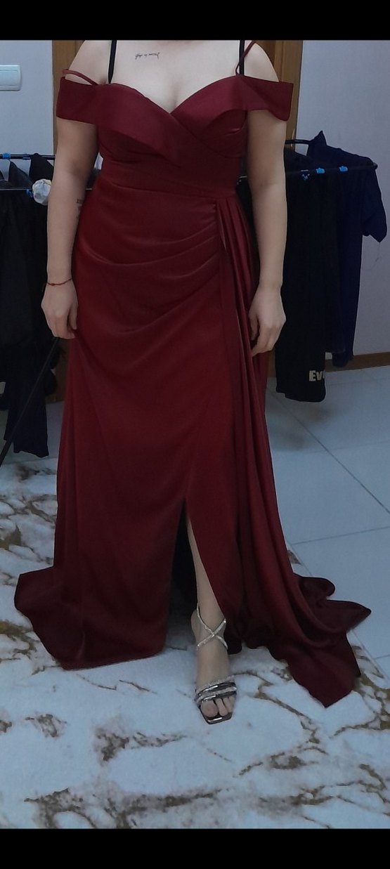 Bordo renkte, drapeli ve V yaka uzun abiye elbise. İnce askılı, vücuda oturan modeliyle şık ve gösterişli bir seçimdir.
