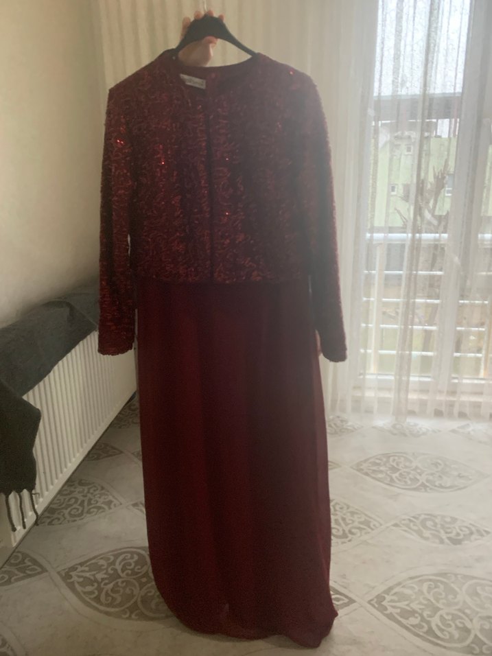 Bordo renkte, uzun kollu ve bisiklet yakalı, drapeli ve vücuda oturan uzun abiye elbise.
