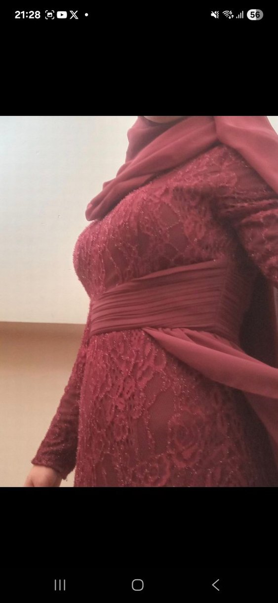 Bordo renkli, uzun kollu ve drapeli detaylı, tekne yaka, desenli, klasik şık abiye elbise. pazarlık payı vardır.