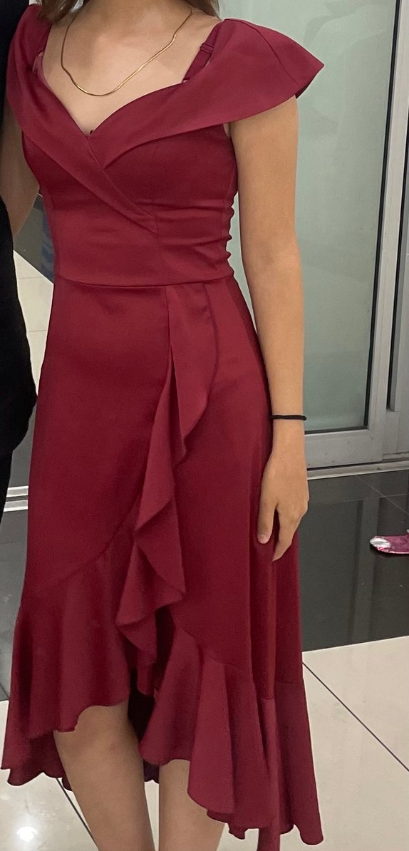 Bordo renkli, straplez ve kolsuz uzun abiye elbise, drapeli detaylar ve vücuda oturan kesimiyle düğünler için uygun vintage bohem tarzını yansıtıyor.