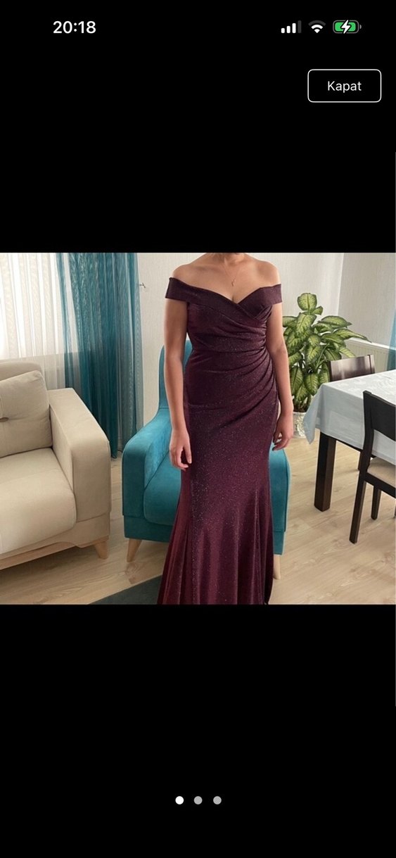 Bordo renkli, drapeli ve V yakalı uzun abiye elbise, ince askılı kollara sahiptir. Düğünler için uygun, klasik ve modern şıklığı bir arada sunar.