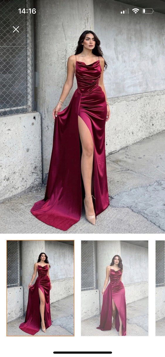 Bordo renkli, drapeli ve V yakalı, ince askılı uzun abiye elbisedir. Parlak kumaşı ve kesimiyle düğünler için uygundur.