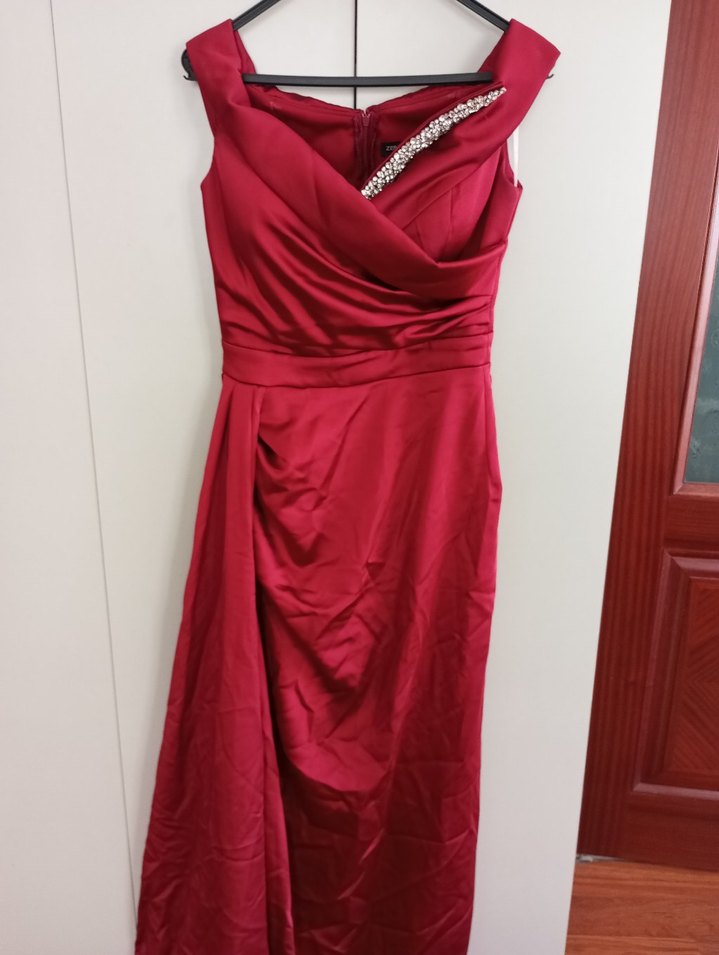 Bordo, drapeli ve tek parça uzun abiye elbise. Kayık yaka ve kolsuz tasarımı ile klasik ve modern şıklık sunar.
