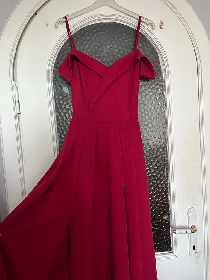 Bordo renkli, ince askılı ve drapeli detaylı, uzun ve vücuda oturan abiye elbise. Modern klasik tarzıyla romantik akşamlar için uygun, desensiz ve koyu tonlarda bir seçim.