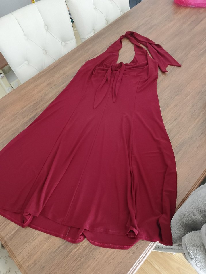 Bordo renkte, drapeli uzun elbise. Askılı ve kolsuz, bol kesim, bohem vintage tarzıyla romantik akşamlar için uygun.