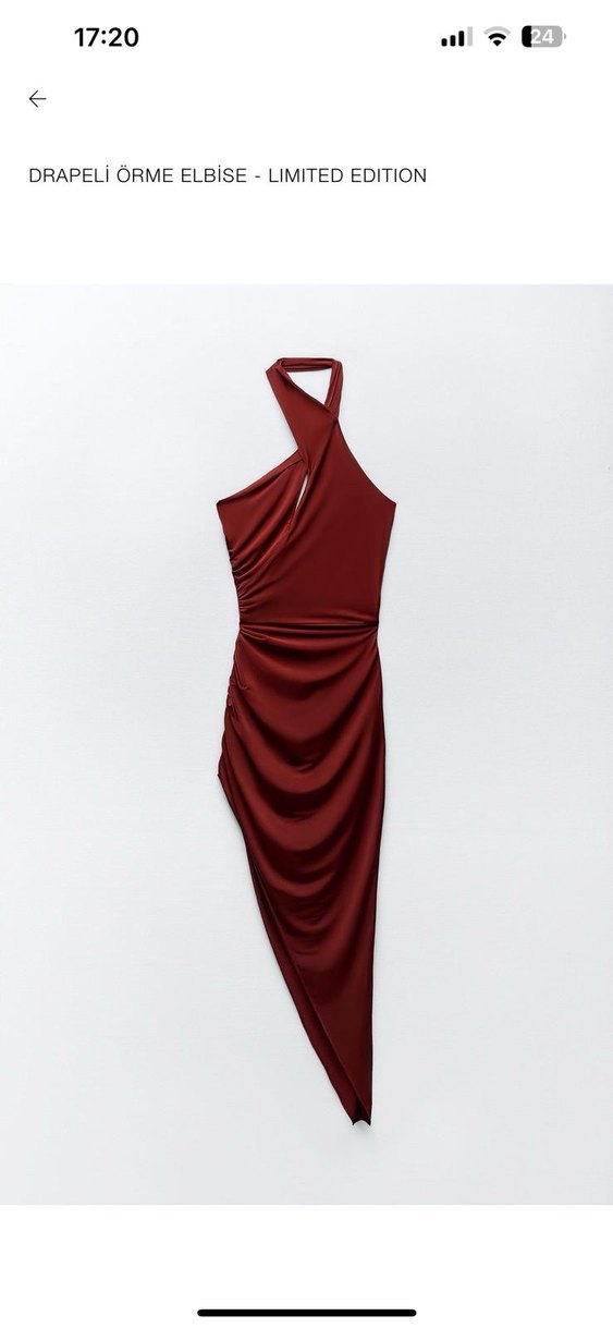 Bordo renkte, yüksek yakalı ve askılı kollu, drapeli tasarıma sahip, sentetik kumaştan yapılmış, uzun ve vücuda oturan elbise.