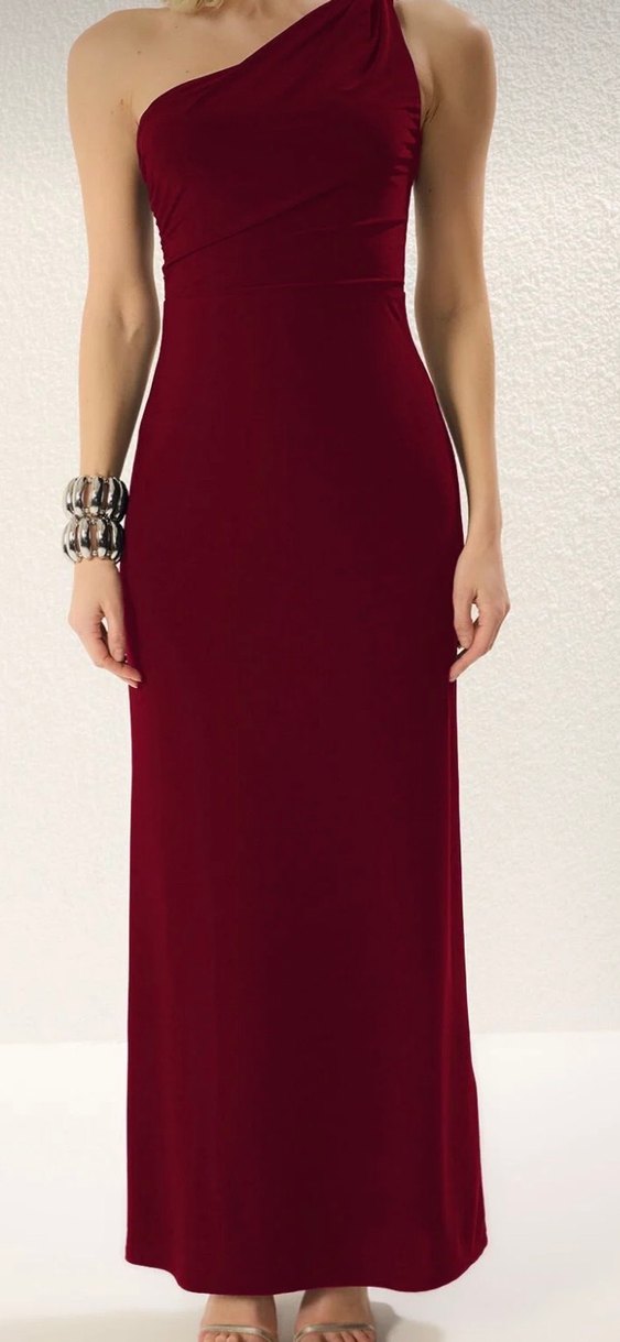 Bordo renkte, drapeli ve askısız yaka tasarımlı, uzun ve vücuda oturan kadın elbisesidir. Düğünler için uygun, şık ve çağdaş bir tarza sahiptir.