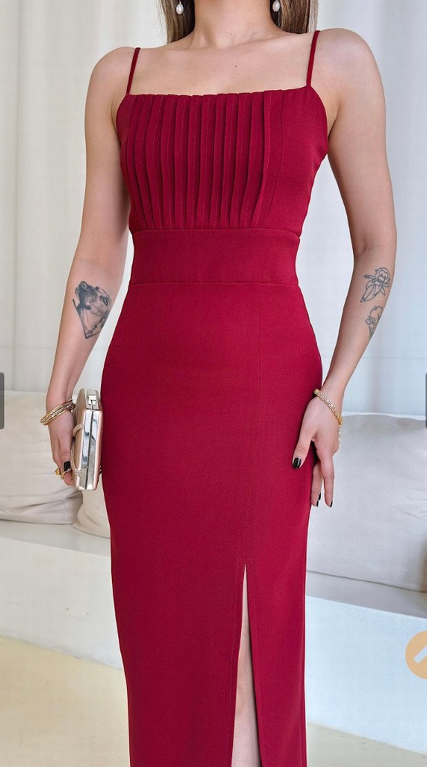 Bordo renkli, askılı ve drapeli detaylara sahip, uzun kalem kesim elbise. İnce ve şık bir görünüm için kaygan kumaştan üretilmiştir. 1 kez giyilmiştir dm üzerinden üstümdeki duruşunu paylaşabilirim