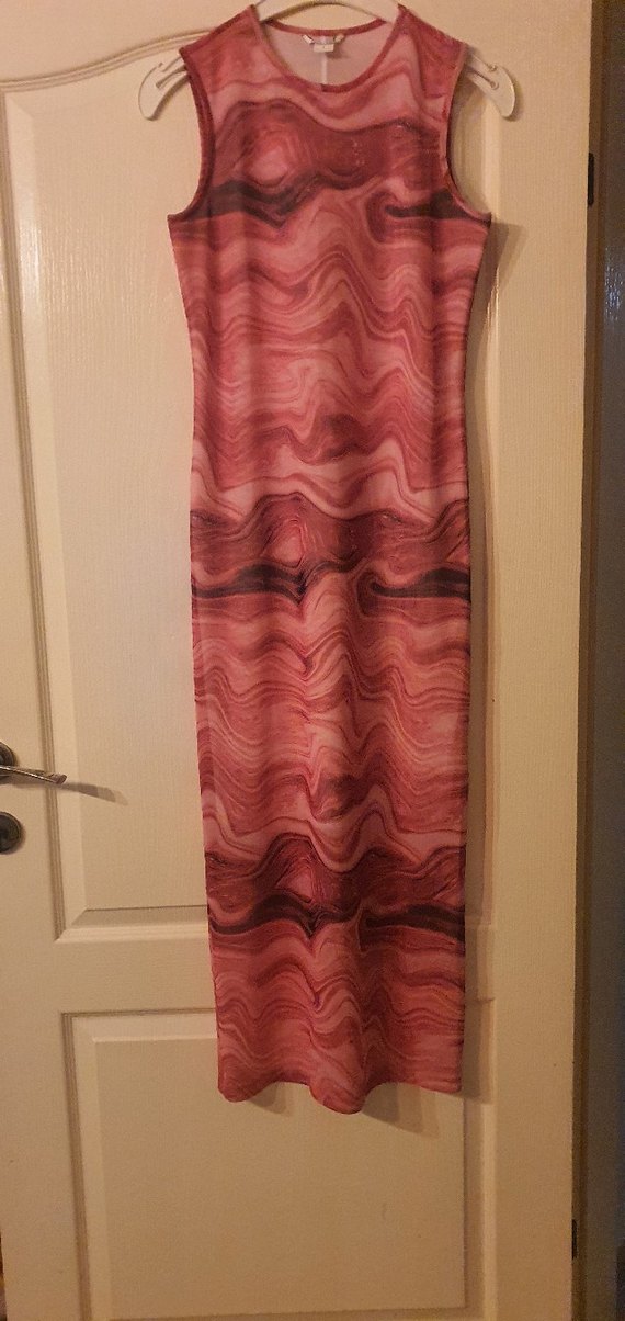 Drapeli, kolsuz, uzun boy elbise, tekne yaka ve parlak bordo bağlama desenlidir. İpeksi kumaştan yapılmış bohem tarzda bir elbisedir.