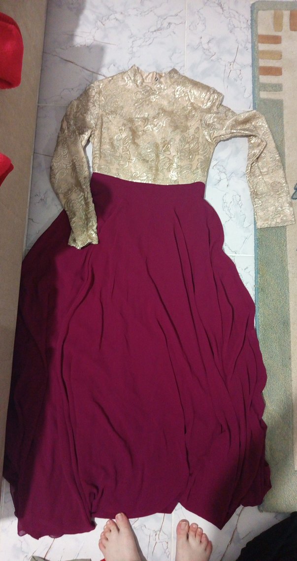 Bordo, uzun ve bol kesim hamile eteği, ipeksi dokusu ve drapeli tasarımı ile dikkat çeker. Parlak kumaşı ve bohem tarzı düğünler için uygundur.