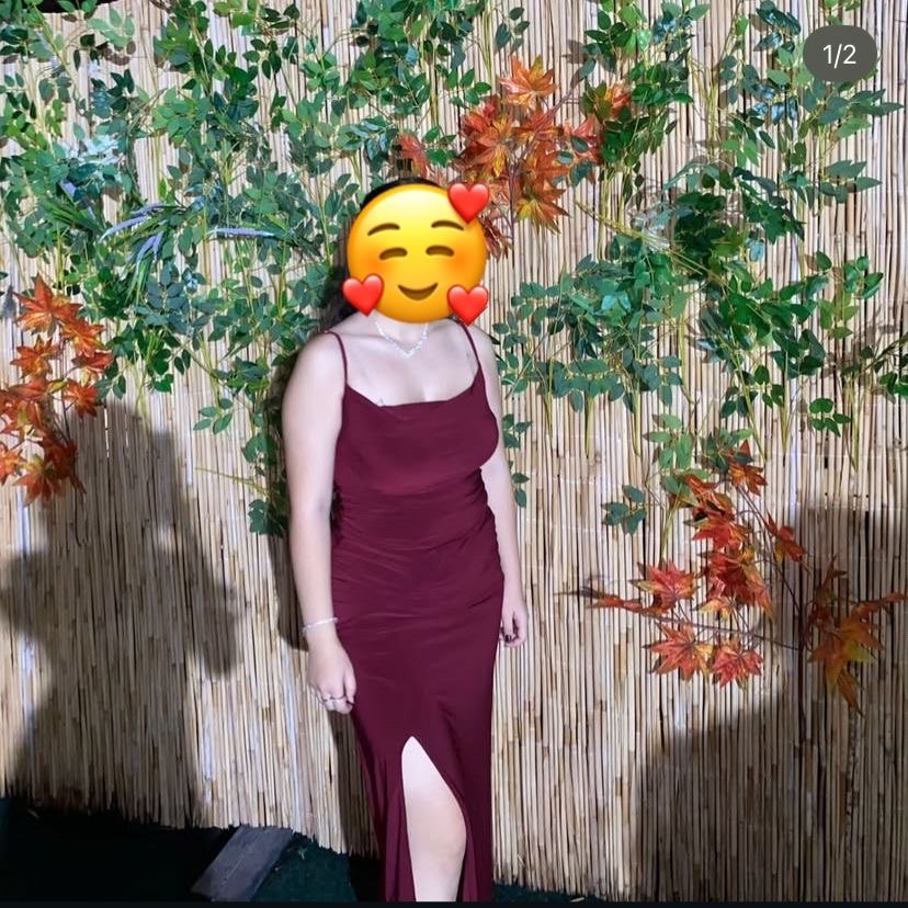 Bordo renkli, ince askılı ve V yakalı bu uzun elbise, drapeli tasarımı ve fit kesimiyle dikkat çeker 2 kez giyildi