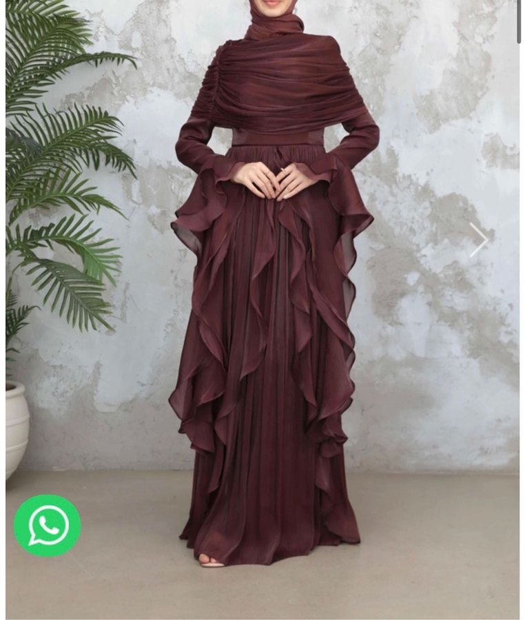 Bordo renkli, uzun boylu, yüksek yakalı ve uzun kollu abiye elbise. Drapeli ve desenli tasarımıyla bol kesim sunar, düğünler için uygun.