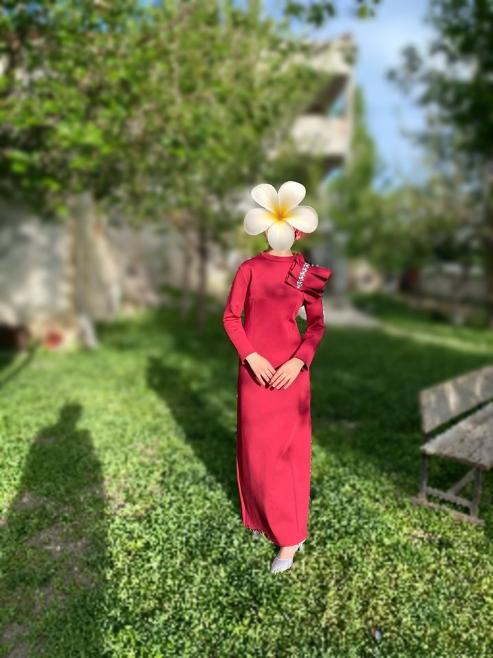 Bordo renkte, ince dokulu kumaştan yapılmış, yüksek yakalı, uzun kollu ve drapeli detaylara sahip uzun, dar kesim elbise. Çiçek desenleri ve avant-garde tarzıyla düğünler için uygundur.