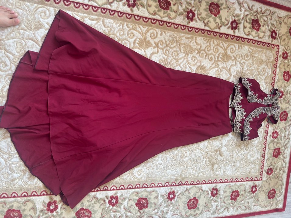 Bordo renkli, V yakalı ve kolsuz, drapeli uzun kadın abiye elbise. İnce kesimi ve parlak kumaşıyla klasik ve şık bir görünüm sunar. Modern bir Kına elbisesi olabilir