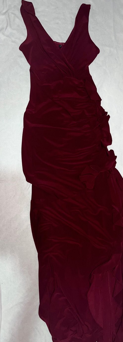 Bordo renkte, uzun ve vücuda oturan bu kadın abiye elbise, kayık yaka ve ince askılarla avant-garde gotik tarzda drapeli detaylar sunar.