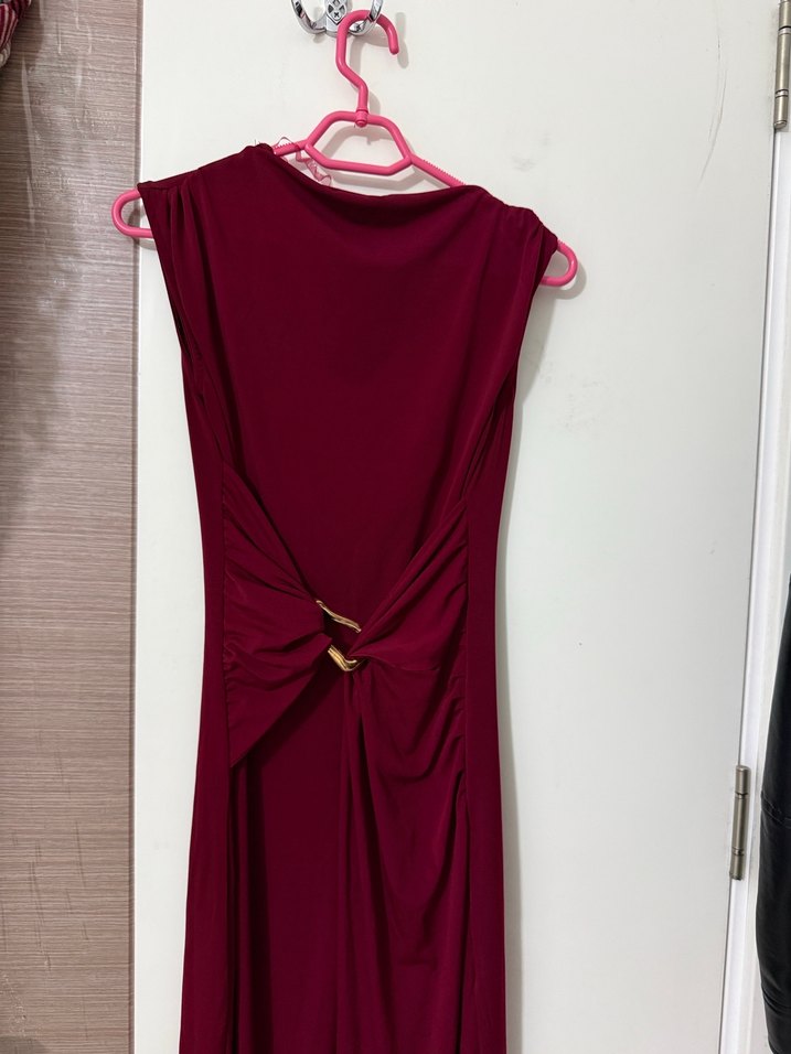 Bordo renkte, kolsuz ve V yaka uzun elbise, drapeli detay ve oturan kesime sahip, yumuşak sentetik kumaştan üretilmiştir. Romantik akşamlar için uygun.
