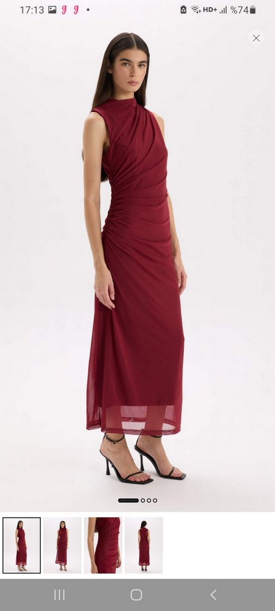 Drapeli, kolsuz ve yüksek yakalı bu bordo uzun elbise, ince kesimiyle romantik akşamlar için uygundur. Sentetik kumaştan üretilmiştir. esnektir küçük bir deformasi var onunda resmini koydum üstüne giyince belli olmuyor