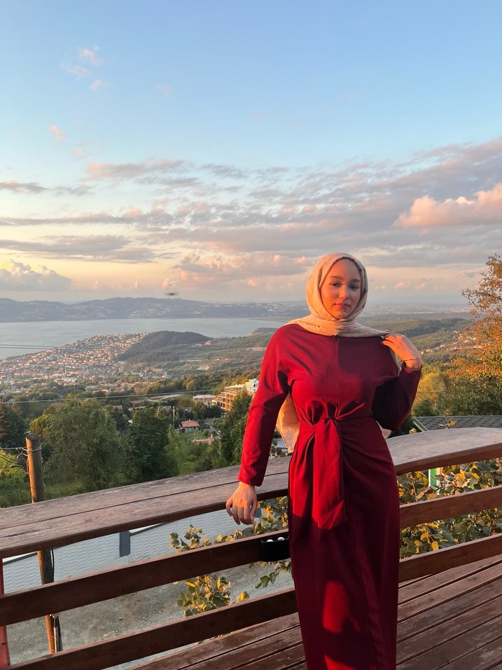 Bordo renkli, drapeli tasarıma sahip, uzun boy ve yüksek yakalı kadın elbisesi. İnce ve parlak kumaştan, etnik desenli, rahat kesim.
