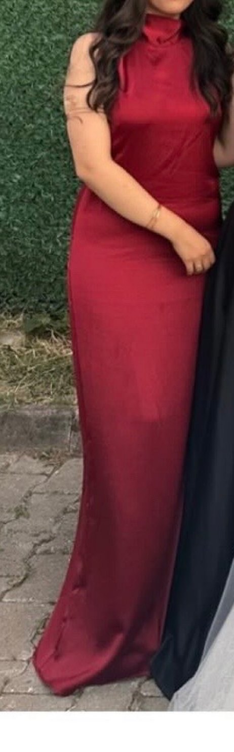 Bordo renkli, drapeli ve V yakalı uzun kadın elbisesi. Sımsıkı kesimi ve kolsuz tasarımıyla dikkat çeker. Romantik akşamlar için ideal.