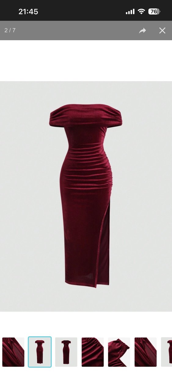 Bordo renkte, drapeli ve uzun kesim kadın elbisesi, tekne yaka ve askılı kollara sahiptir. Yumuşak süet kumaştan yapılmıştır, romantik akşamlar için uygundur.