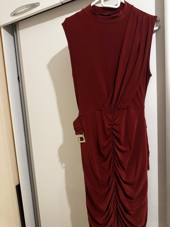 Bordo renkte, kolsuz ve yüksek yakalı uzun elbise. Drapeli detayları ve dar kesimiyle romantik akşamlar için uygundur.