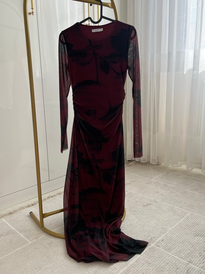 Bordo tonlarında, bağlamalı desenli, yüksek yakalı ve uzun kollu, drapeli uzun kesim, vücuda oturan kadın elbisesi. Sentetik kumaştan, modern ve avangart tarzda, romantik akşamlar için uygun.