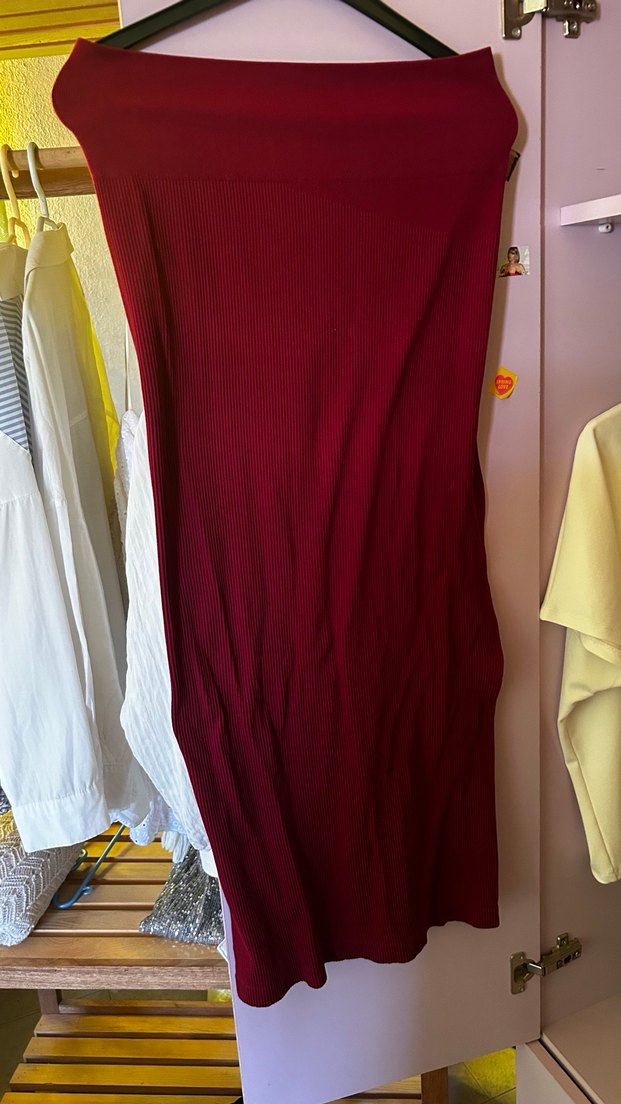 Bordo renginde, sentetik kumaştan, drapeli detaylı, uzun ve vücuda oturan kadın eteği. Minimalist ve sokak stiliyle günlük kullanıma uygun.