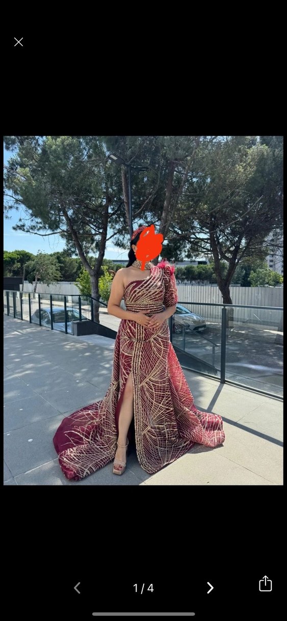 Bordo renkli, straplez yaka ve drapeli tasarıma sahip uzun, kına elbisesi Parlak desenli kumaşı ve ince askılarıyla bohem ve avangard tarzda, kına için uygundur.