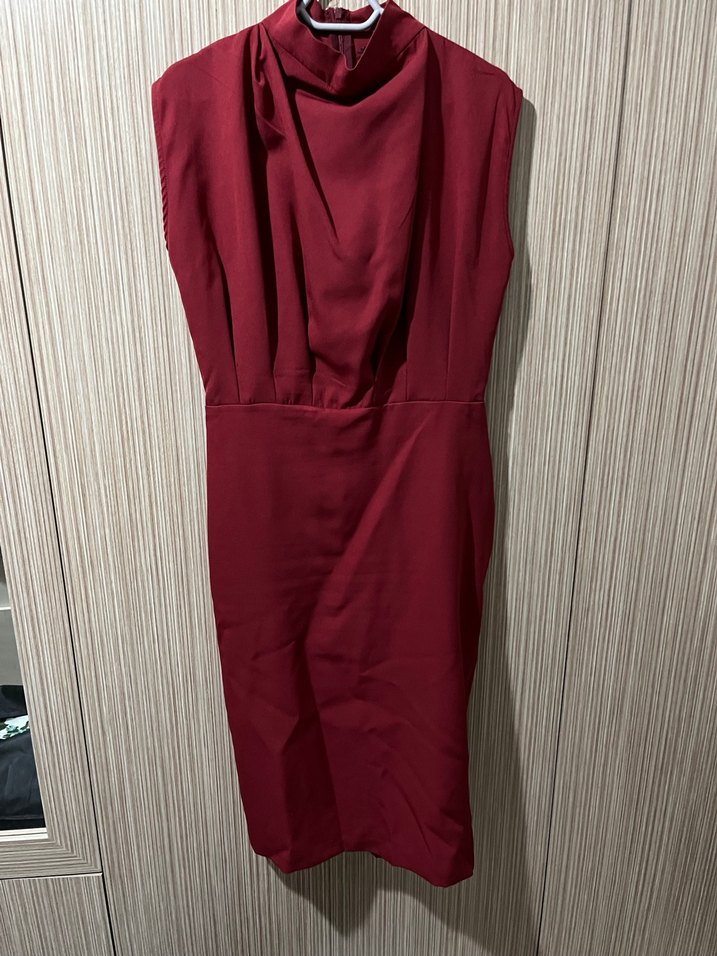 Bordo renkli, kolsuz, drapeli ve yüksek yakalı uzun klasik kadın elbisesi, modern şıklık sunar. M-L bedene uygundur. Çok az kullanıldı. Hiçbir defosu yoktur