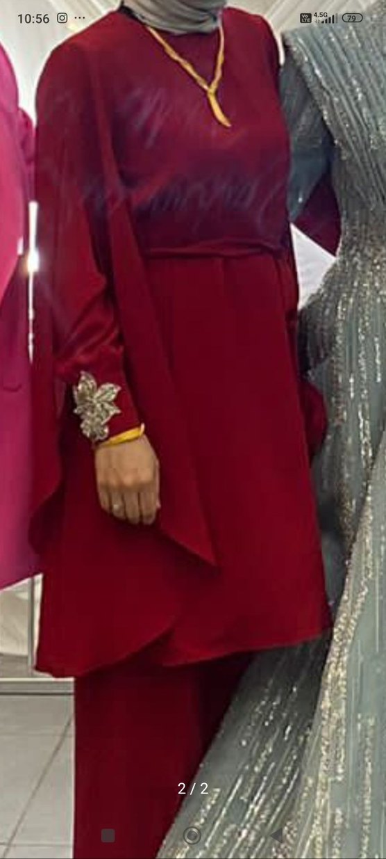 Senna Design markalı. Bordo renkli, drapeli ve uzun kollu, bileklerde bıncuk işlemeli pantolonlu takım. Modest ve gösterişli bir tasarıma sahiptir. ✨