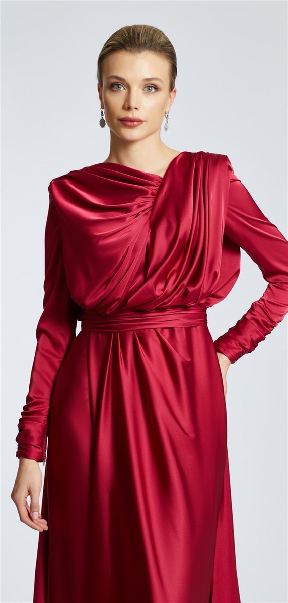 Bordo parlak kumaştan, drapeli ve uzun kollu, tek renk uzun abiye elbise. Tekne yaka ve klasik şıklık sunar.
