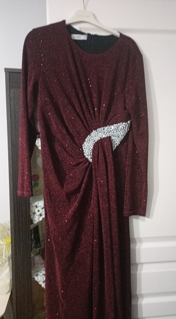 Bordo renkli, uzun kollu ve drapeli detaylı bu kadın abiye elbise, belde parlak süslemeye sahiptir. Klasik zarafeti yansıtan çağdaş ve sade bir tasarıma sahiptir.